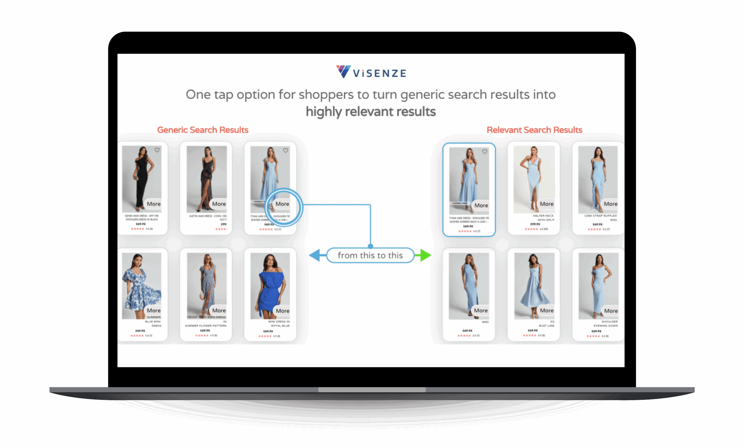 ViSenze to platforma oparta na sztucznej inteligencji, zaprojektowana z myślą o branży ecommerce i handlu detalicznym online. Jej głównym celem jest ułatwienie klientom wyszukiwania i odkrywania produktów poprzez wykorzystanie rozpoznawania obrazu oraz analizy wizualnej.Dzięki technologii ViSenze sklepy internetowe mogą wdrażać funkcje takie jak wyszukiwanie wizualne, rekomendacje produktów podobnych czy automatyczne tagowanie zdjęć..Platforma analizuje obrazy produktów, rozpoznaje ich cechy (np. kolor, fason, styl) i na tej podstawie pomaga klientom szybciej odnaleźć interesujące ich artykuły. ViSenze integruje się z popularnymi systemami ecommerce, takimi jak Shopify, Magento czy WooCommerce.