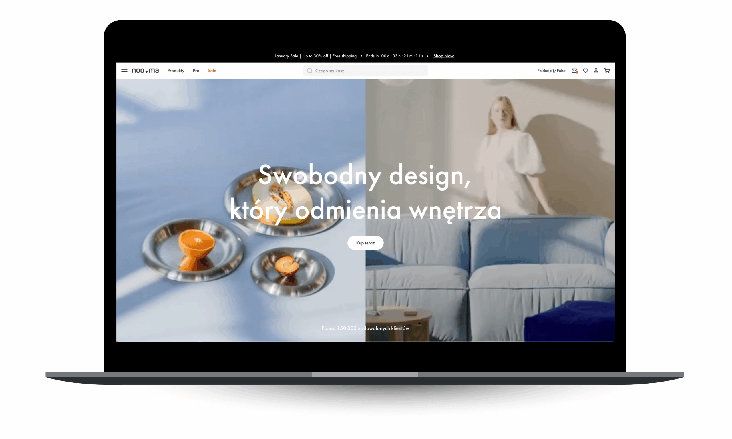 Noo.ma to synonim nowoczesnego podejścia do designu i sprzedaży. Ich sklep na Shopify to lekcja minimalizmu, gdzie produkt zawsze znajduje się w centrum uwagi. Marka mistrzowsko operuje przestrzenią (tzw. white space), co sprawia, że przeglądanie mebli przypomina wizytę w cyfrowym showroomie. Sklep wyróżniają niezwykle płynne przejścia między kategoriami i zaawansowana prezentacja wariantów materiałowych, która pozwala poczuć jakość produktu bez dotykania tkaniny.