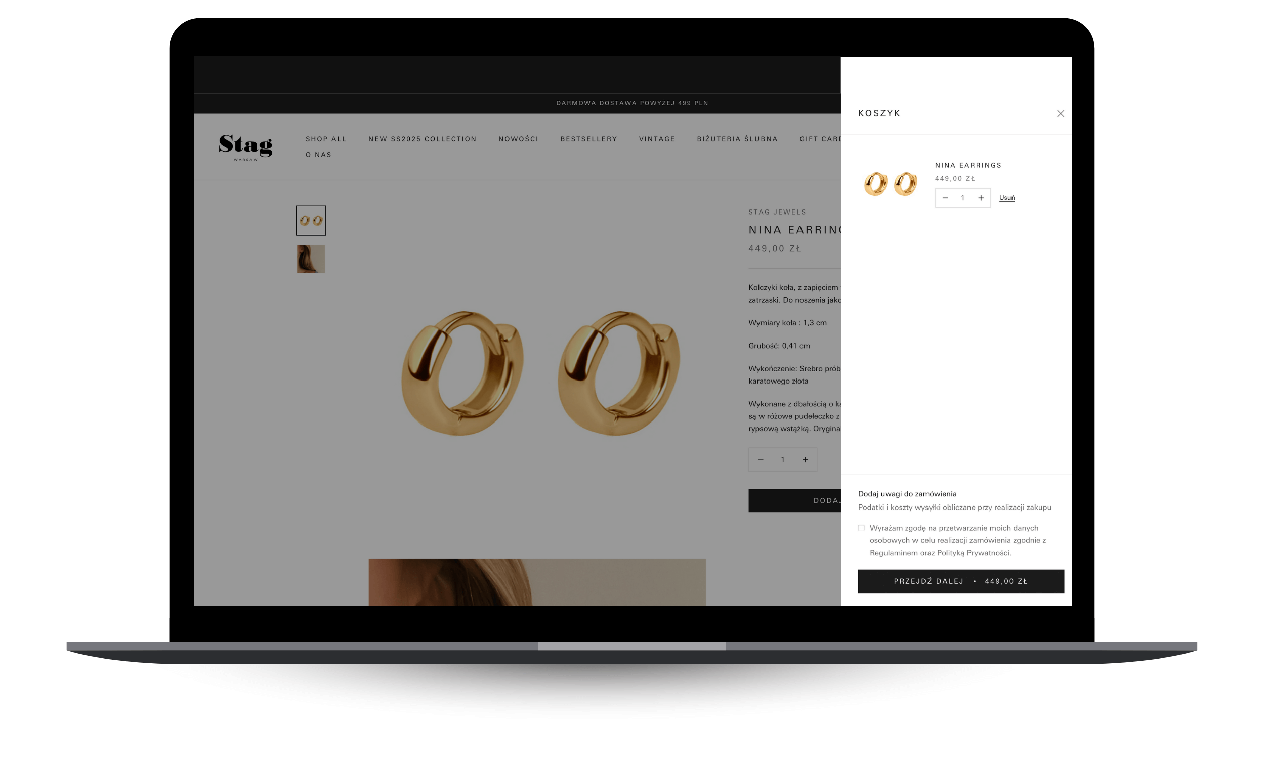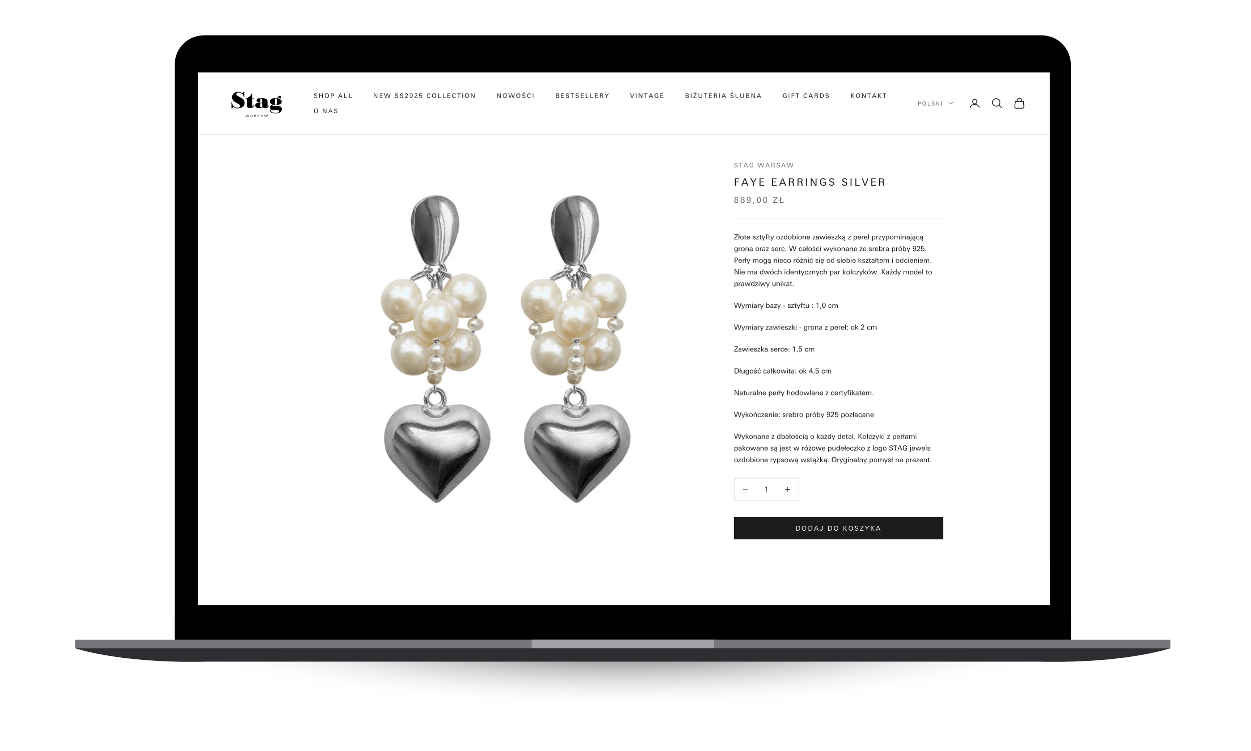 Projekt migracji z Shoper do Shopify trwał około 3 miesiące. W ramach kompleksowej modernizacji sklepu internetowego marki Stag Warsaw zrealizowano szereg działań mających na celu poprawę funkcjonalności, estetyki oraz dostosowanie do potrzeb klientek. Przeprowadzono wdrożenie nowego szablonu graficznego zgodnego z aktualnymi standardami UX/UI oraz dostosowano go do specyfiki marki. Uruchomiono angielską wersję językową strony, wprowadzono możliwość zakupu kart podarunkowych, a także zautomatyzowano kluczowe procesy sprzedażowe – od wysyłki i fakturowania po kontakt z klientem. Dodatkowo zaimplementowano system marketing automation wraz z dystrybucją kodów powitalnych oraz przeprowadzono migrację SEO. Proces zakończyła zmiana domeny z www.stagjewels.com na www.stagwarsaw.com.