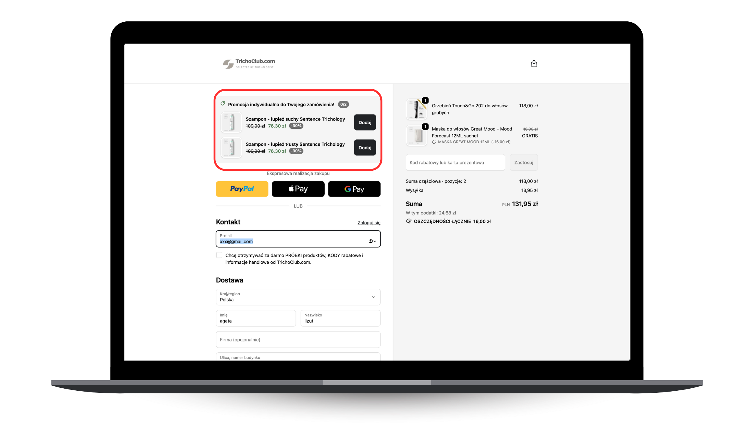 Efektem wdrożenia Cross-Sellingu w Checkout było podniesienie średniej wartości koszyka o kilkanaście procent, zwiększenie konwersji o kilka procent oraz zwiększenie lojalności klientów marki TrichoClub.