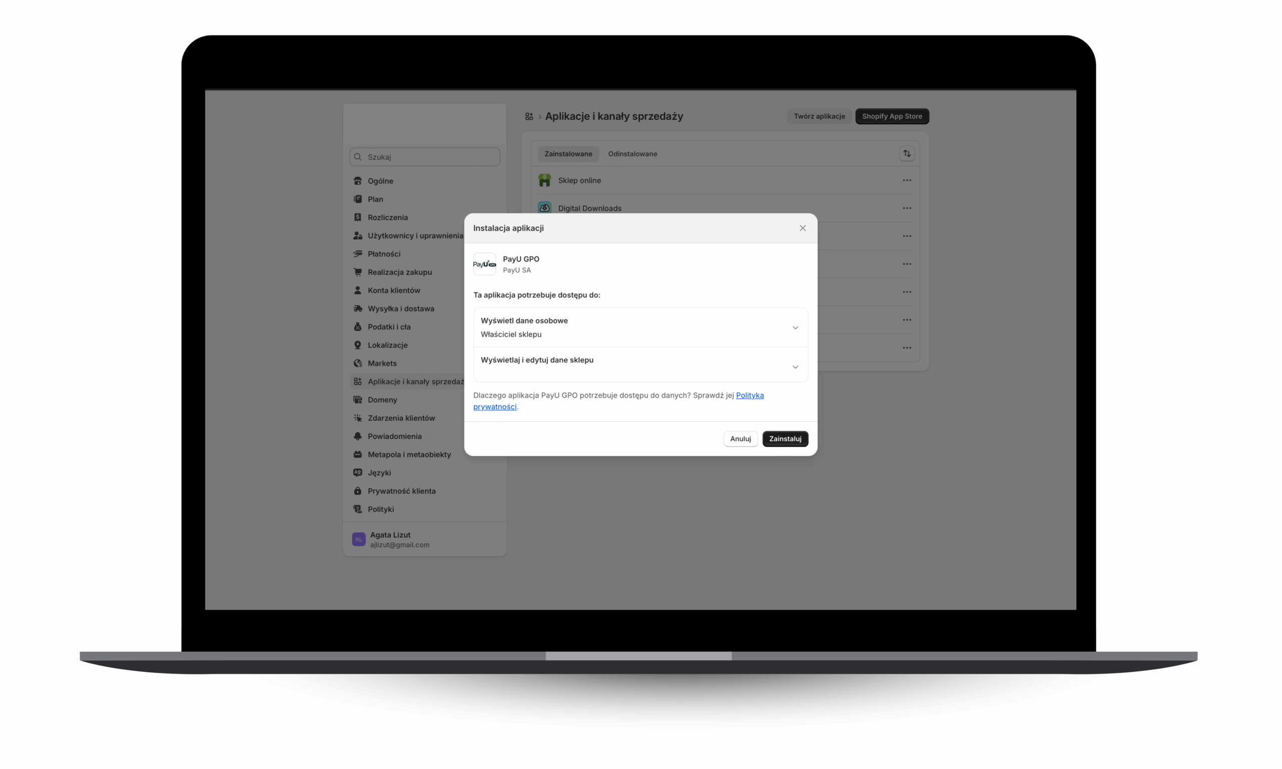 Panel instalacji aplikacji w Shopify.