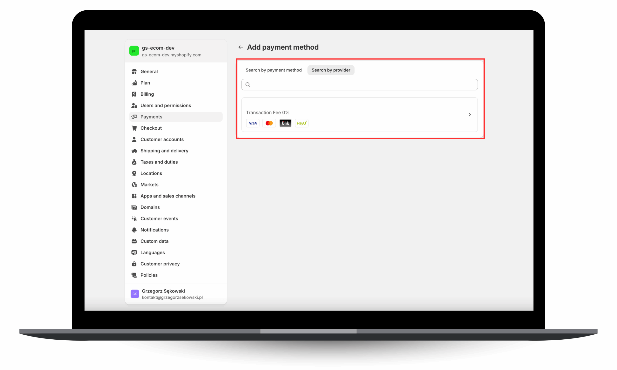 Panel dodawania metod płatności w Shopify.