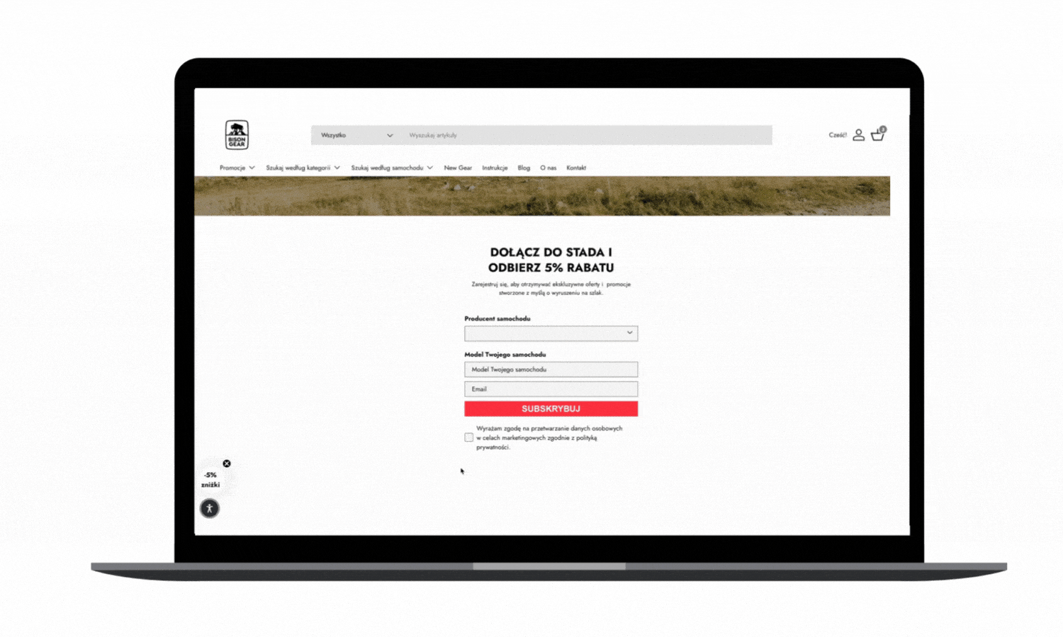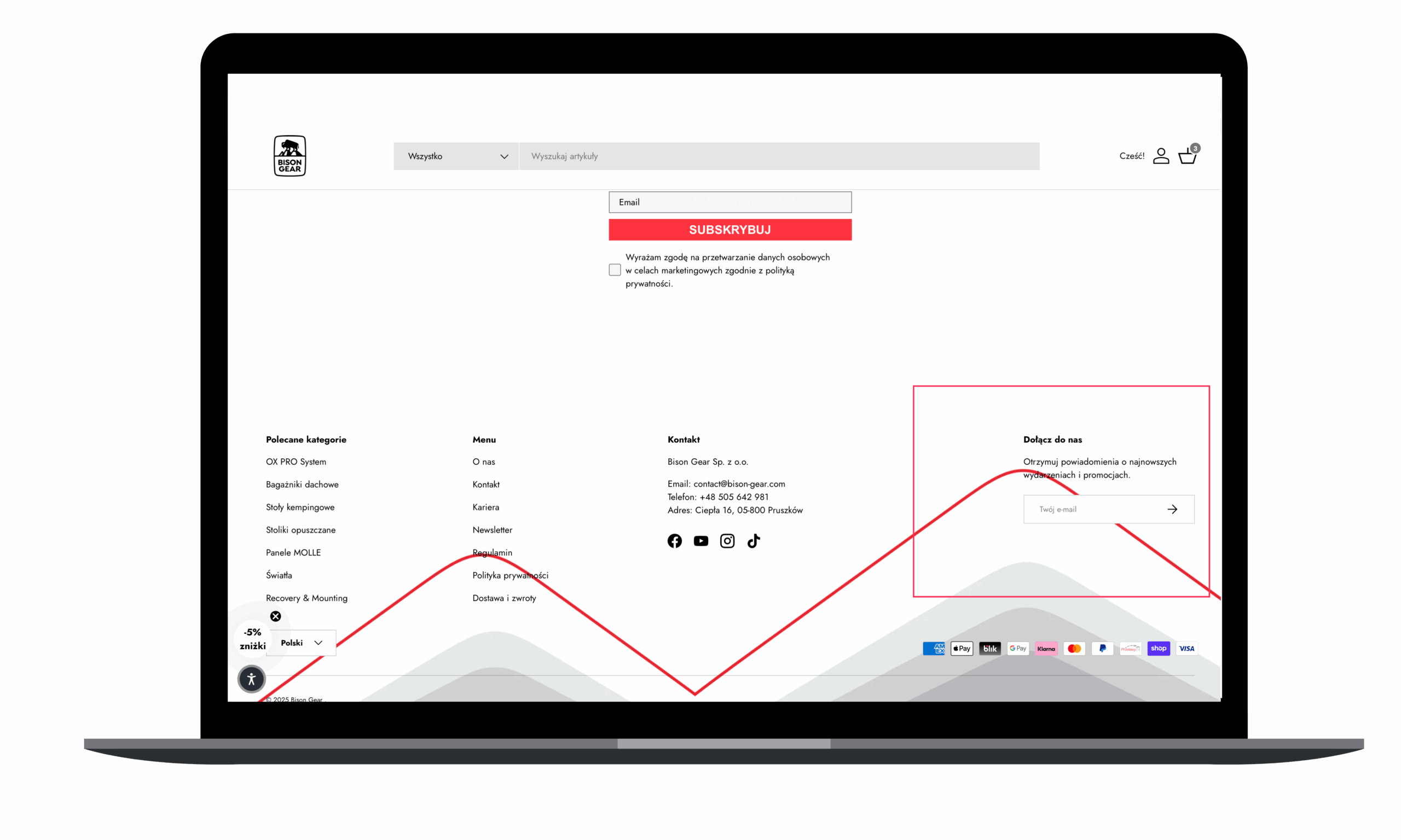 Wdrożony formularz osadzony w sekcji Newsletter dla sklepu Bison Gear.