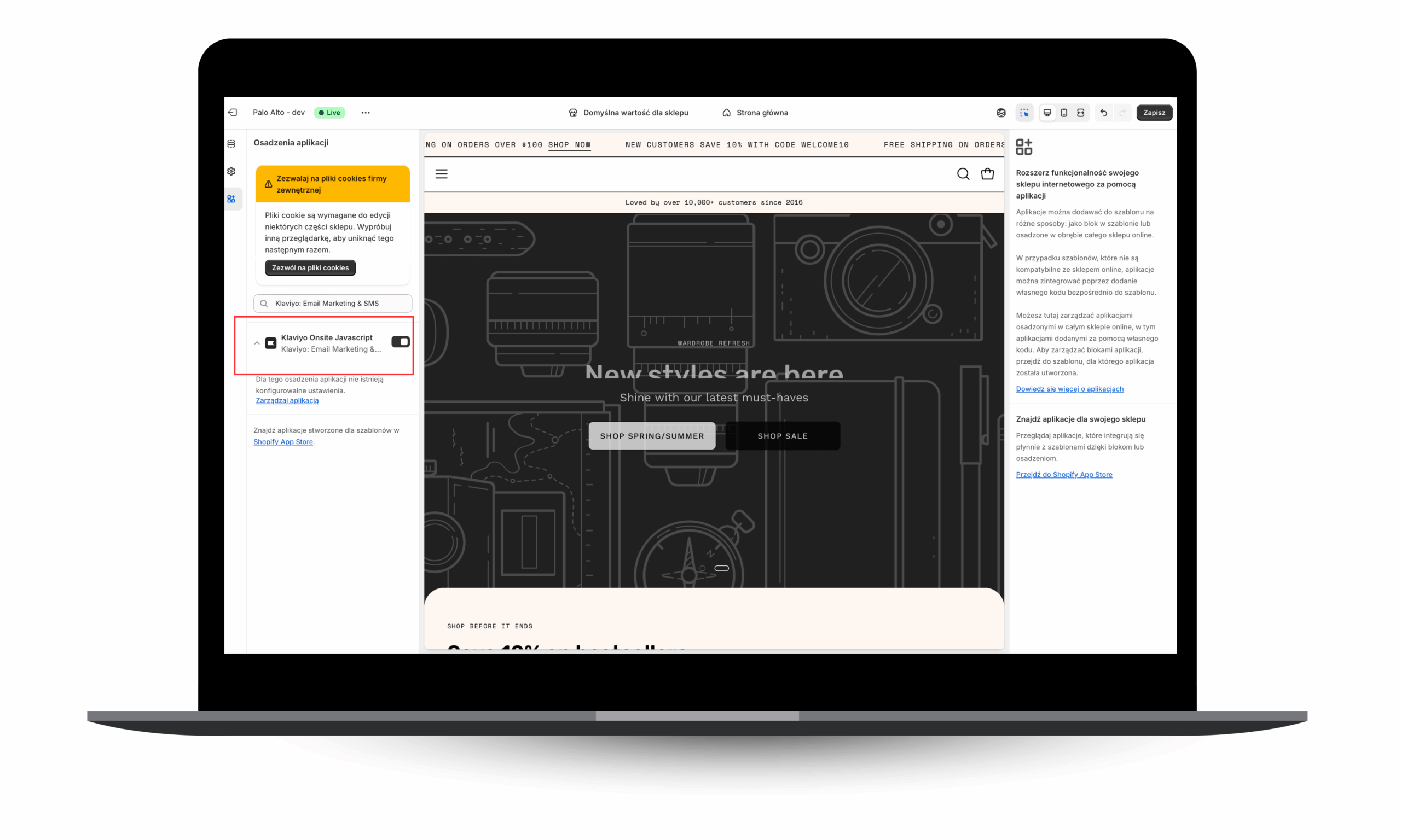 Integracja z Shopify to dopiero początek. Aby w pełni wykorzystać potencjał Klaviyo (np. Abandoned Cart czy Viewed Product), musisz zainstalować snippet śledzący (Klaviyo Active On-Site Tracking).