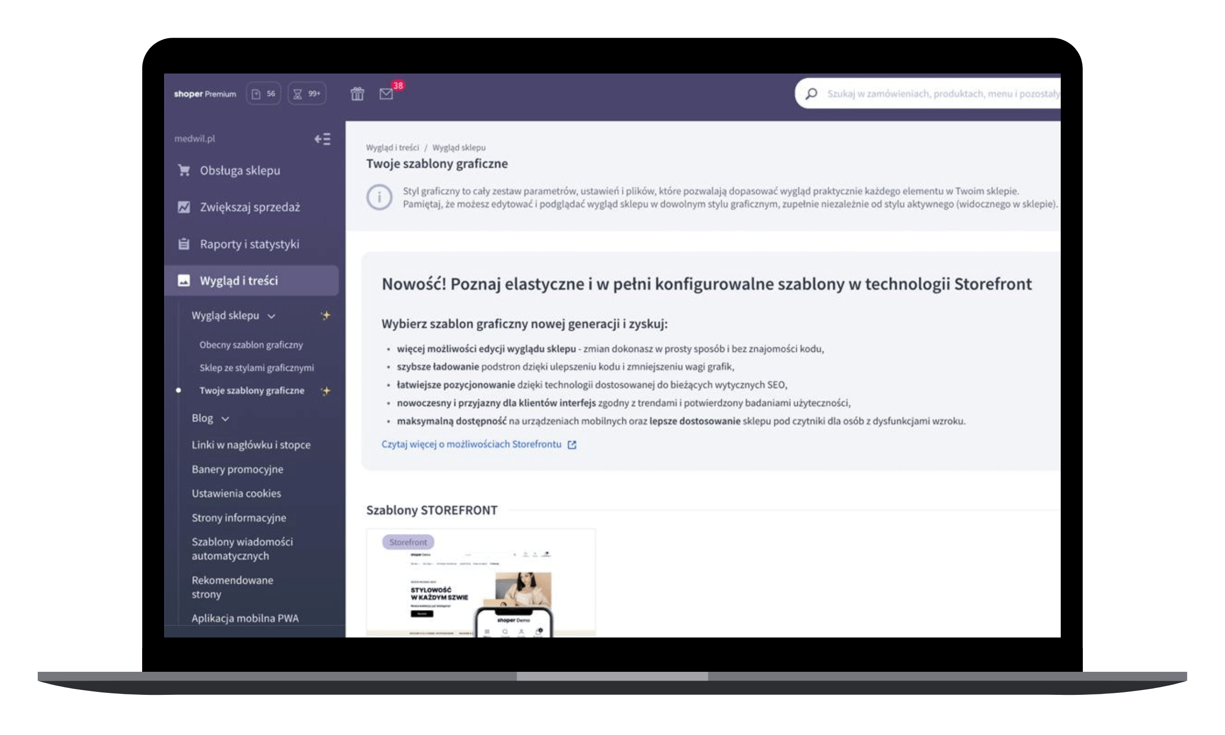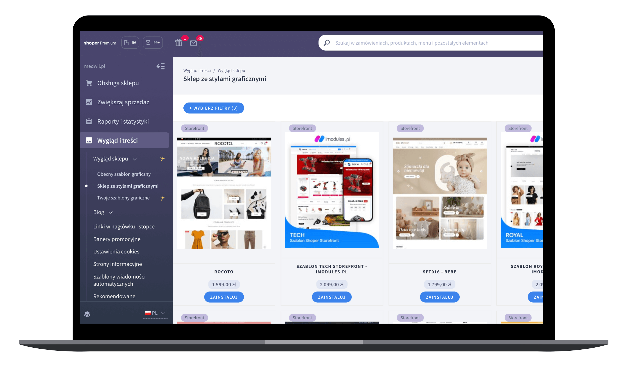 Shoper oferuje prosty w obsłudze system personalizacji wyglądu sklepu z gotowymi, estetycznymi szablonami. Osoby bez wiedzy technicznej mogą wprowadzać zmiany wizualne przez edytor graficzny, natomiast bardziej zaawansowani użytkownicy mają możliwość modyfikacji kodu i głębszego dostosowania frontu sklepu do indywidualnych potrzeb.