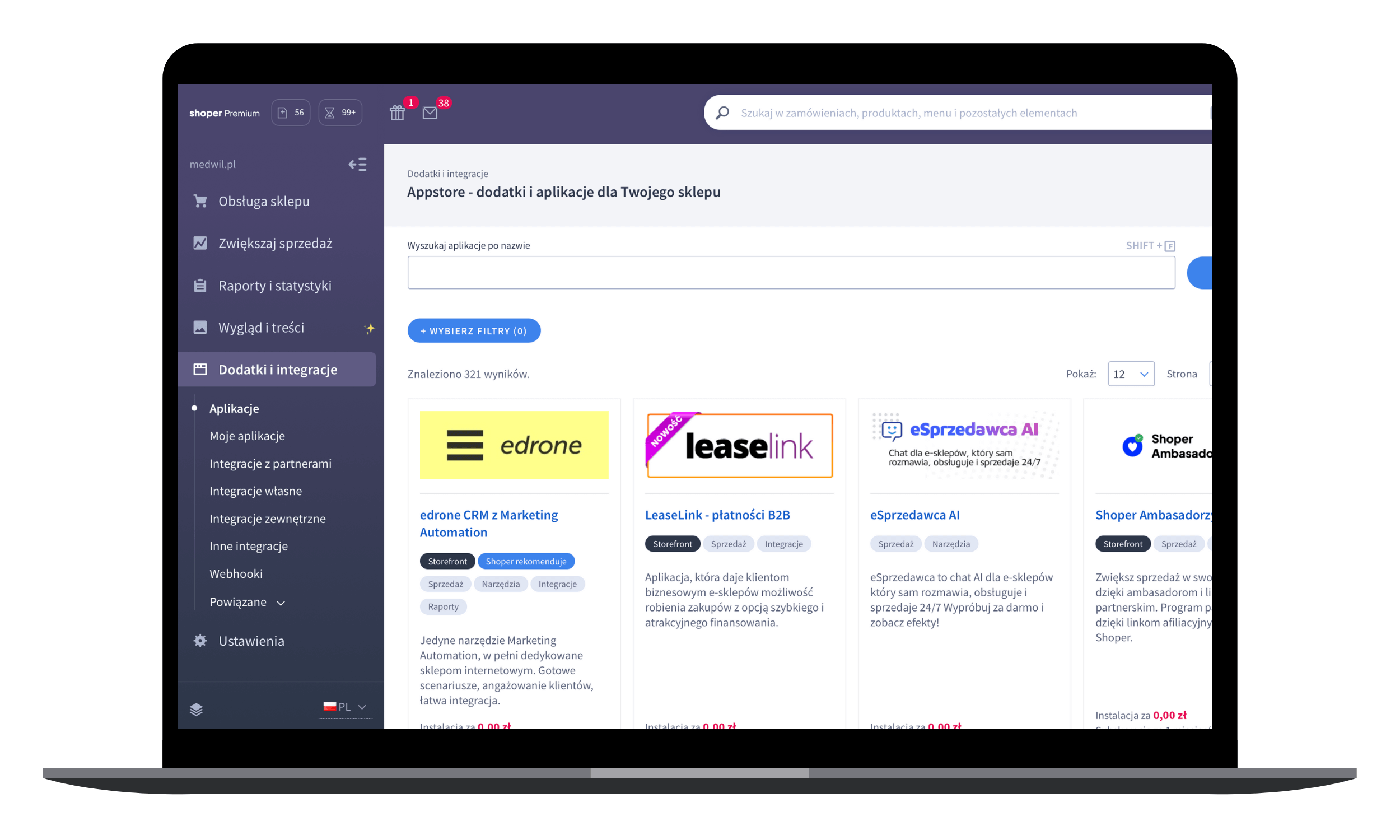 Kwestia ta jest dużo bardziej rozbudowana w Shopify. Popularne systemy płatności czy narzędzia analityczne są dostępne bezpośrednio w panelu CMS, co upraszcza obsługę sklepu. Jeśli jednak chcemy wzbogacić sklep o nowe możliwości lub zintegrować go z popularnymi platformami marketingowymi, możemy skorzystać z Shopify App Store, który oferuje około 12 000 darmowych i płatnych aplikacji.