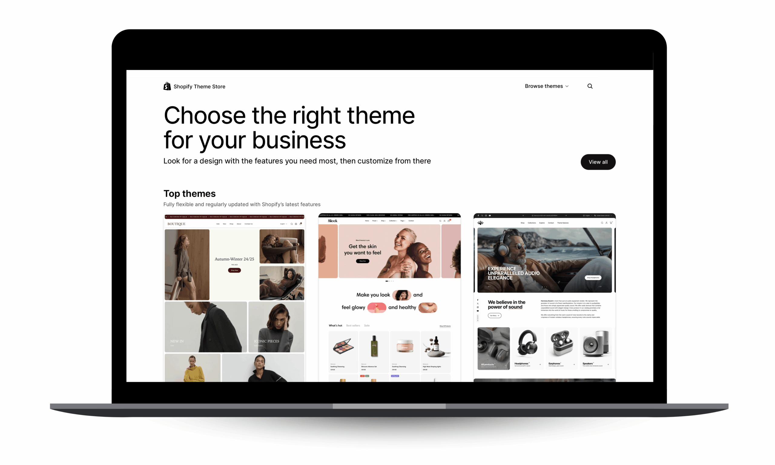 Shopify udostępnia ponad 200 gotowych motywów do pobrania z Theme Store Shopify. Koszty motywów premium wynoszą do $400. Instalacja odbywa się w przyjazny sposób z poziomu Shopify Polska.