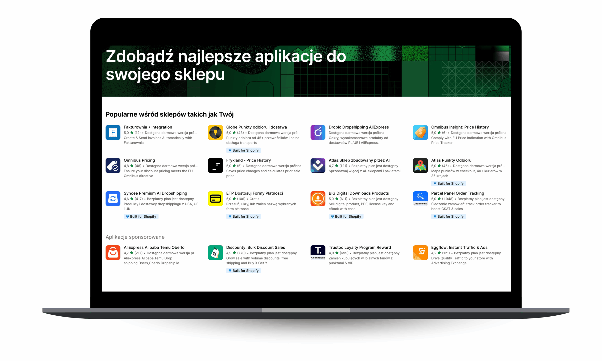Ze względu na popularność platformy oraz przemyślaną infrastrukturę systemu, Shopify udostępnia AppStore Shopify, w którym możliwe jest dodawanie wszelkiego rodzaju aplikacji do naszego sklepu na Shopify. W szybki i bezpieczny sposób możemy zainstalować wybraną aplikację np. Cross-Selling. Shopify App Store oferuje blisko 8.000 darmowych i płatnych aplikacji.