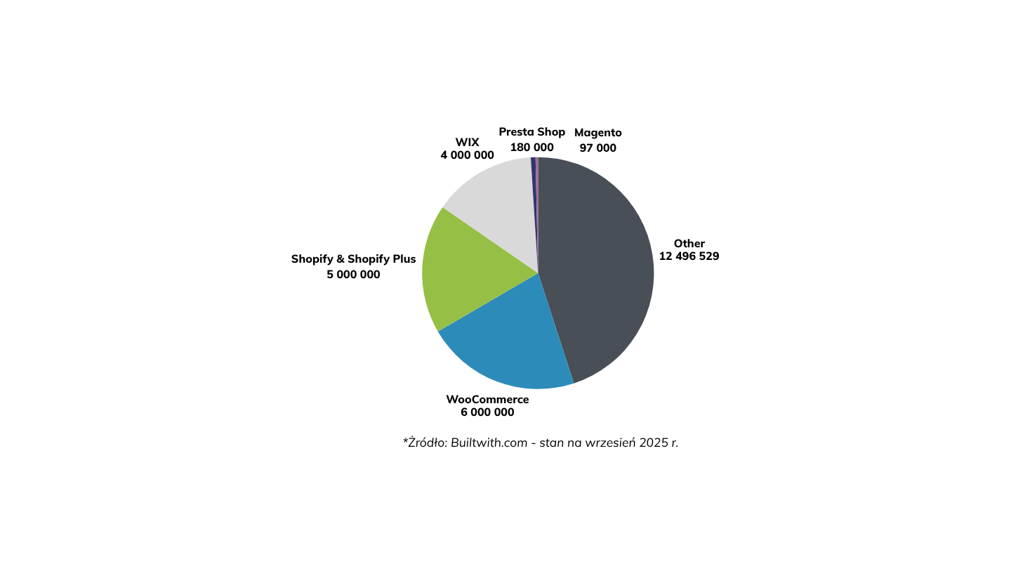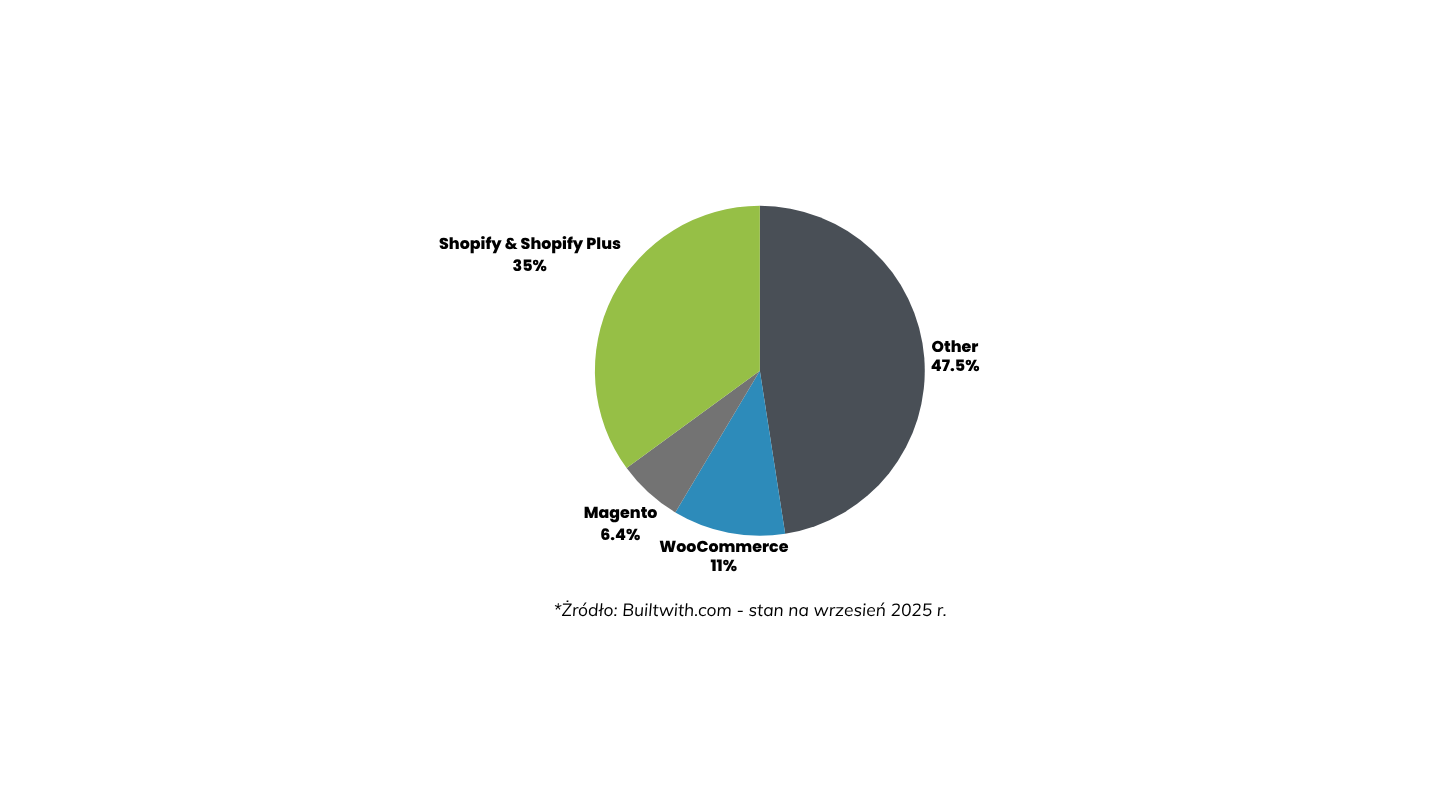 Jeżeli przyjrzymy się 1 mln najlepszych sklepów internetowych na świecie (z najwyższym ruchem), to Shopify posiada najwyższy udział, bo aż 35% (Shopify 25%, Shopify Plus 10%). WooCommerce zajmuje drugie miejsce, z wynikiem 11% udziału rynku ecommerce.*